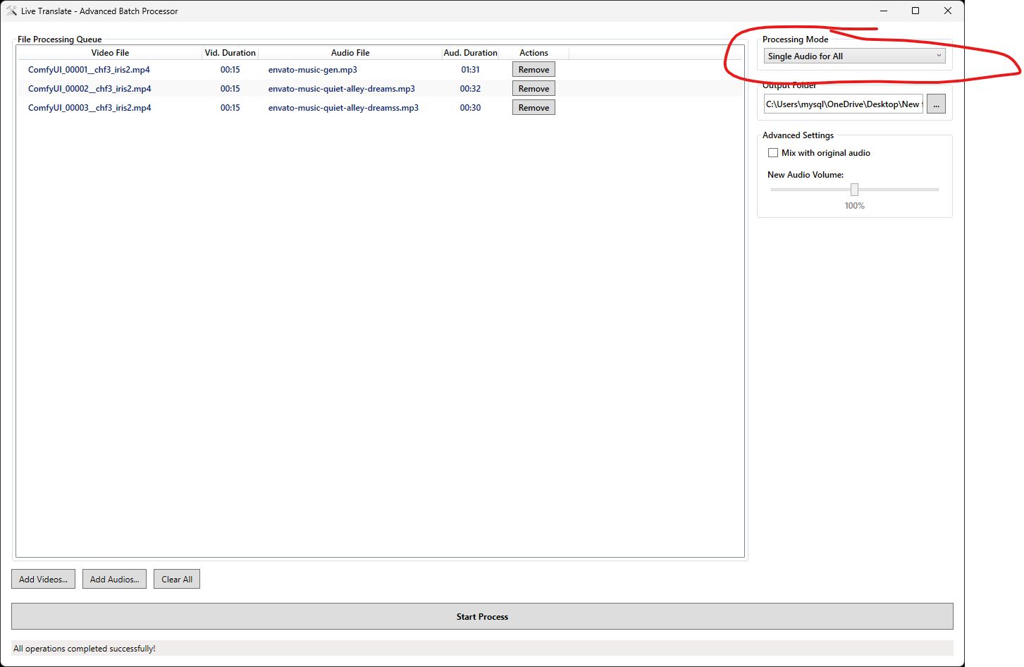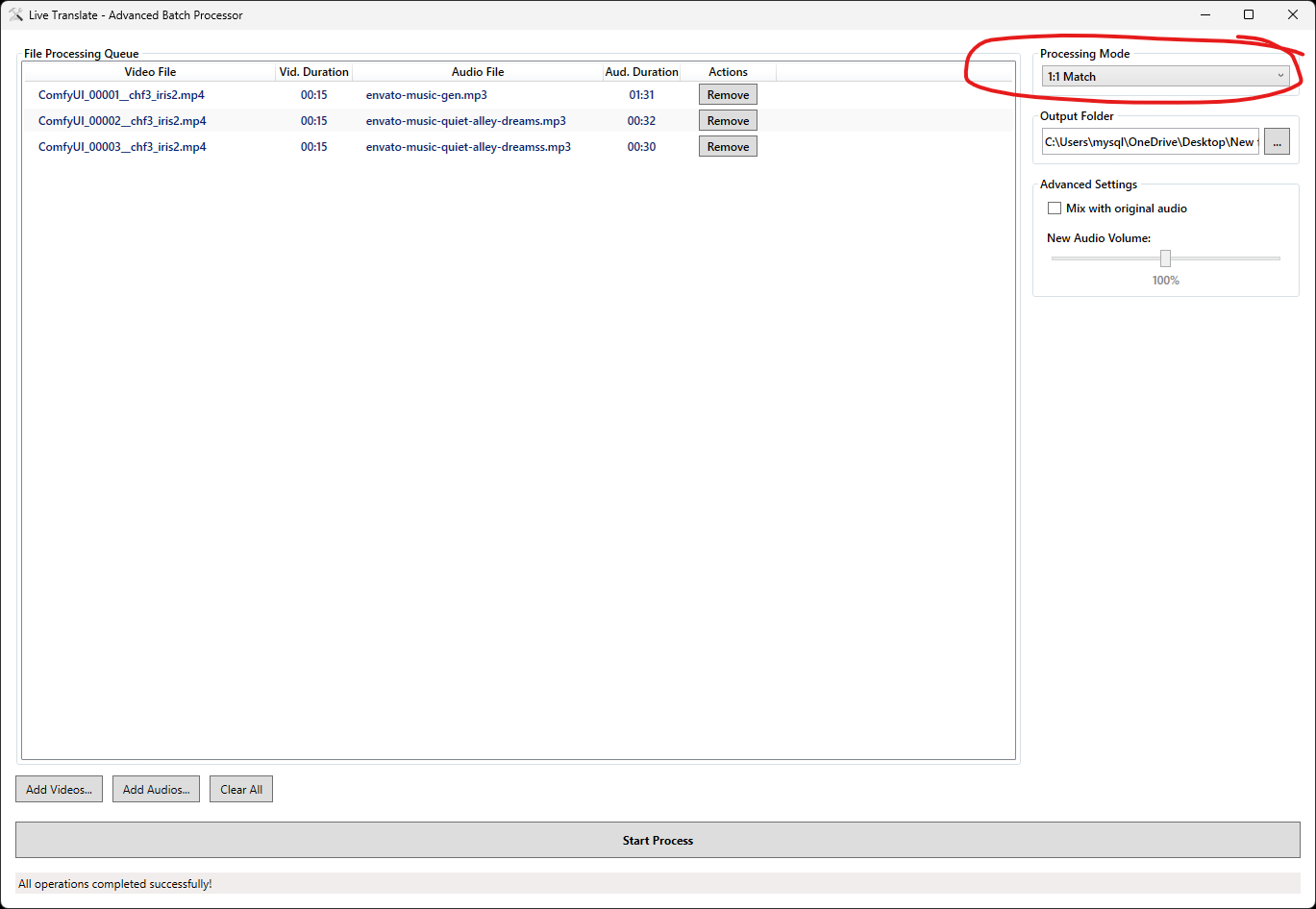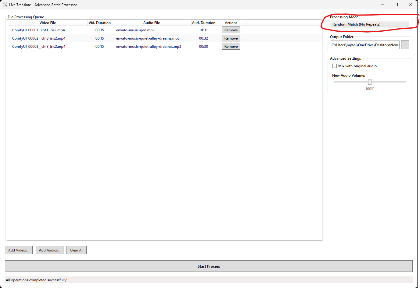 Introduced Advanced Processing Modes: Added three distinct modes: "1:1 Match", "Single Audio for All", and "Random Match (No Repeats)".