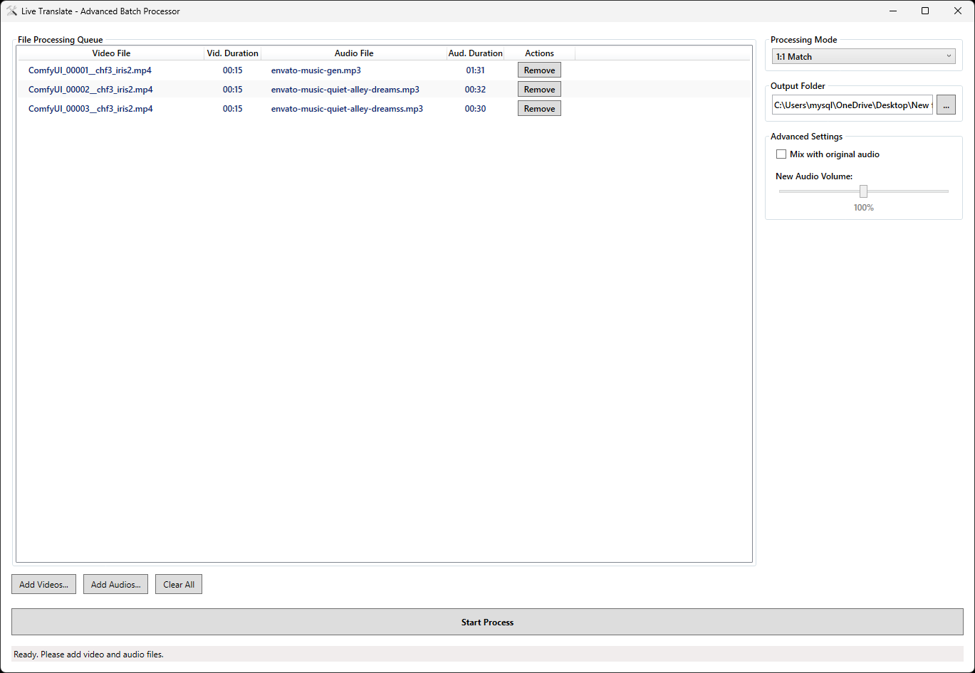 Introduced Advanced Processing Modes: Added three distinct modes: "1:1 Match", "Single Audio for All", and "Random Match (No Repeats)".