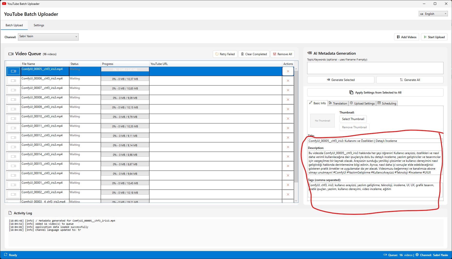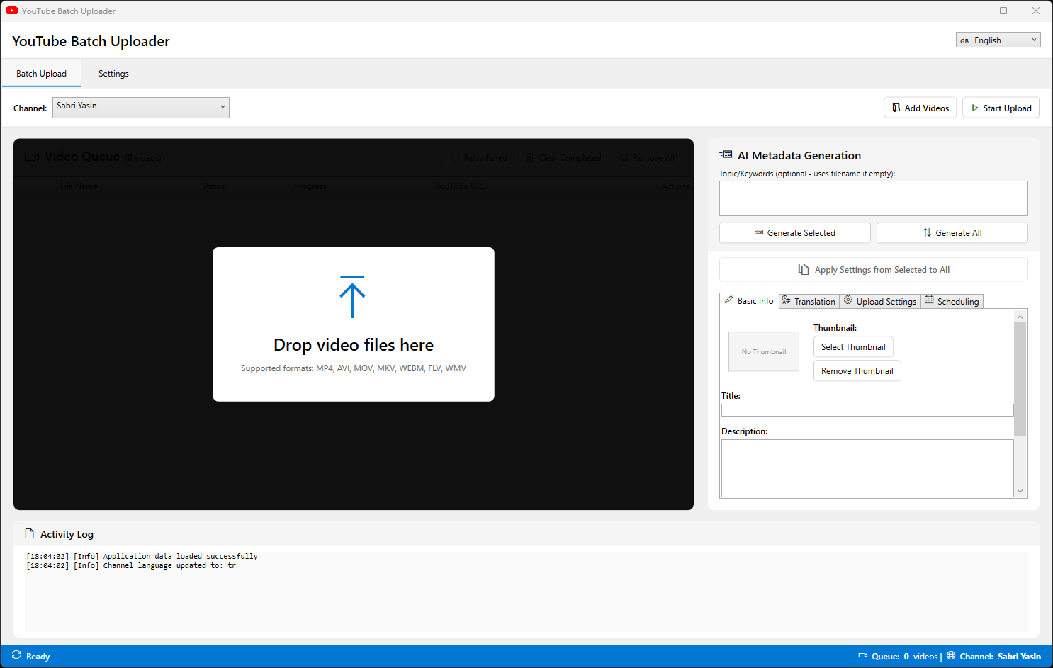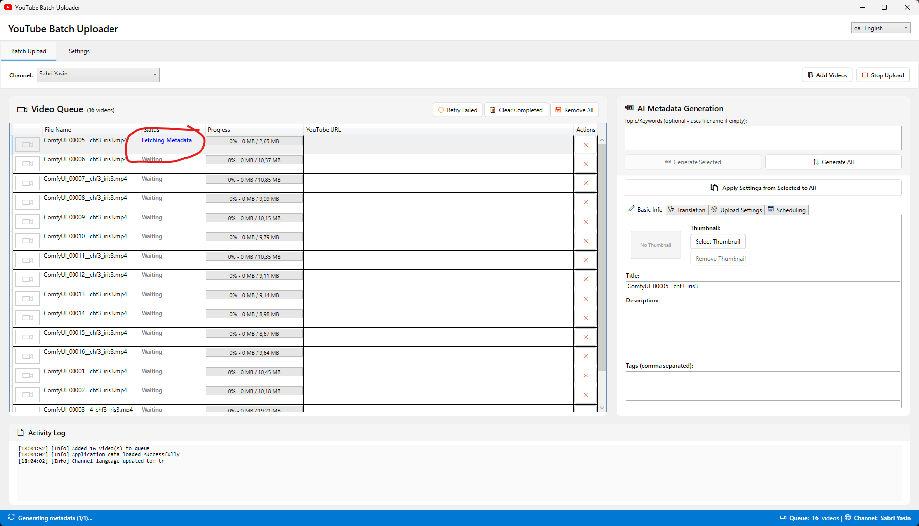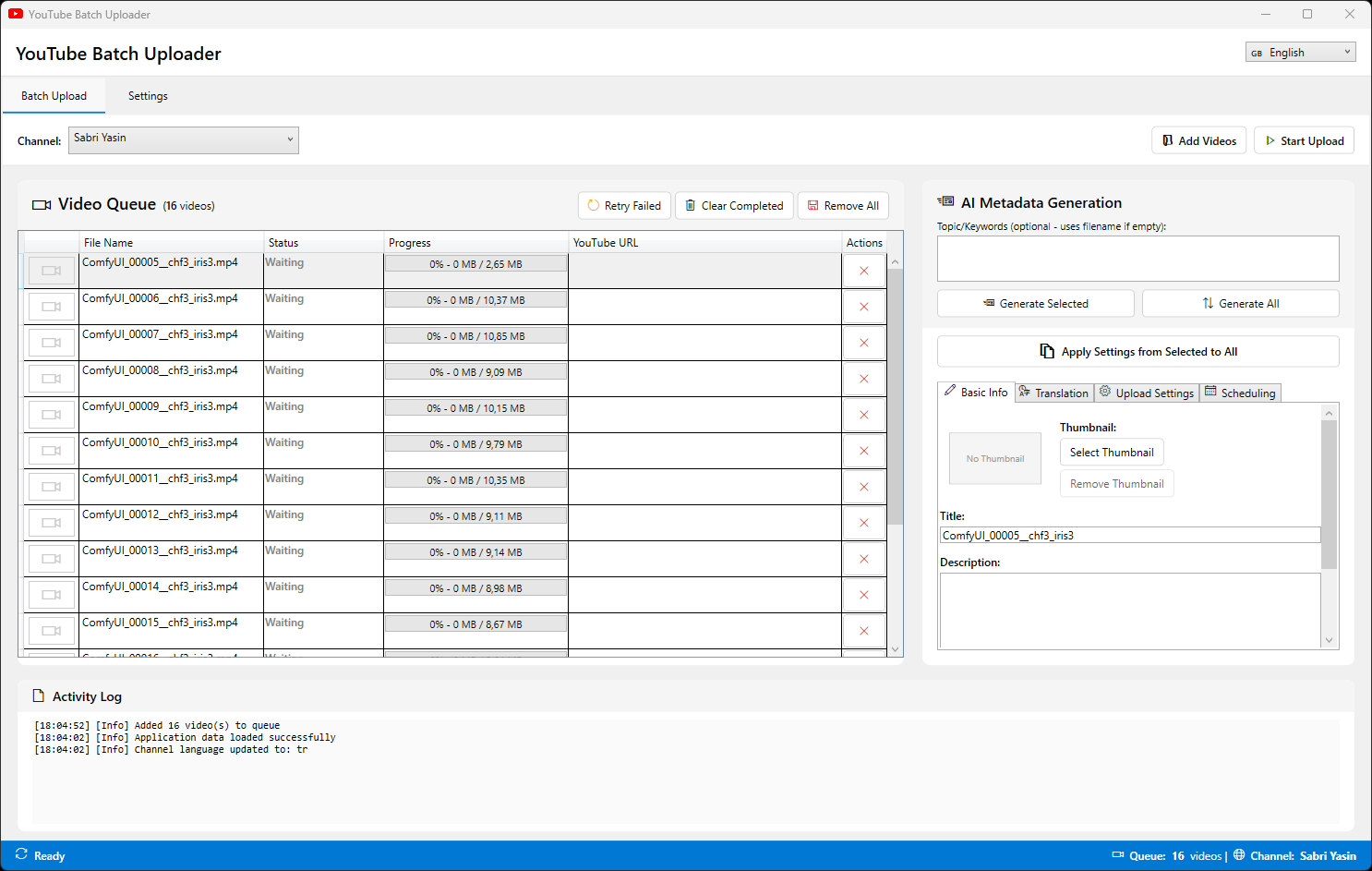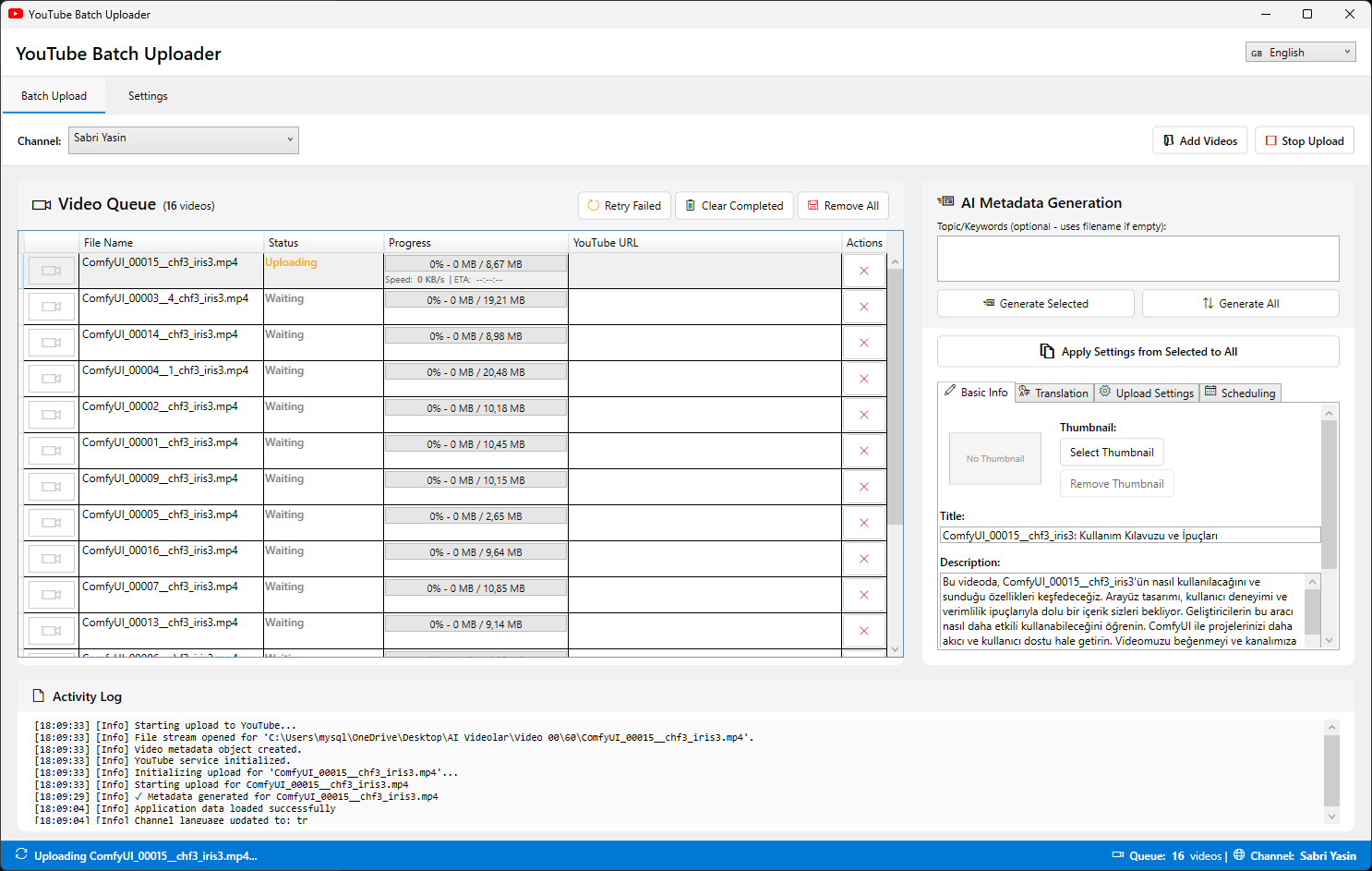 3. Managing Metadata (Title, Description, Tags): Manual Editing: Click on a video in the queue. You can manually edit its details in the "Basic Info" tab on the right. Automatic Generation with AI: Select one or more videos from the queue. In the "AI Metadata Generation" section, optionally enter keywords about the video's topic. Click "Generate Selected" for the selected videos, or "Generate All" for the entire queue.