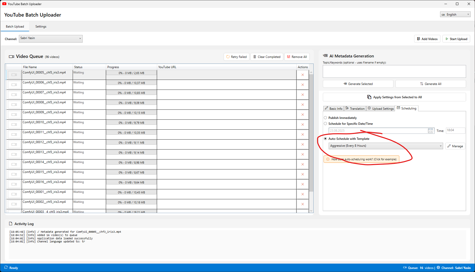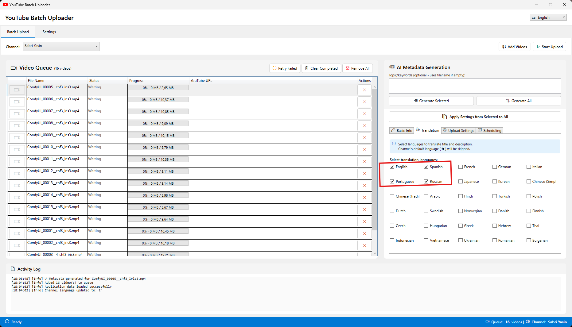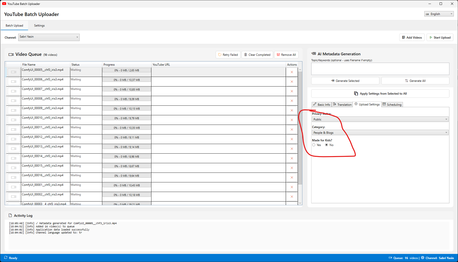 4. Upload Settings and Scheduling: Select a video from the queue and use the tabs on the right to configure its settings: Translation: Check the languages for automatic translation. Upload Settings: Set the privacy, category, and "Made for Kids" status. Scheduling: Choose when the video should be published, or use a template for advanced scheduling.