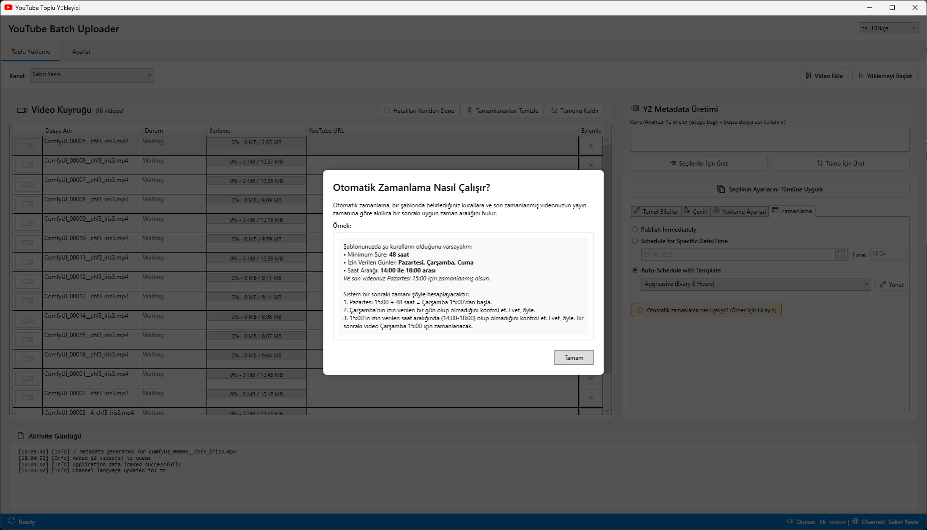 2. Advanced Video Queue System Bulk Addition: Add hundreds of videos to the upload queue in a single operation. Detailed Tracking: Monitor the real-time status of each video (Waiting, Uploading, Completed, Error), its progress (%), and its final YouTube link upon completion. Flexible Control: Easily remove videos from the queue before an upload begins or clear all completed entries to keep your workspace tidy.
